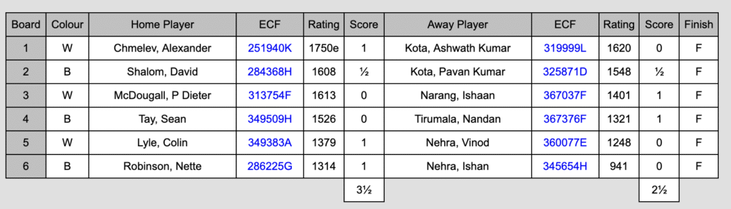 Alexander Chmelev, an excellent addition to the club this season, led the way with a win on board 1. Colin Lyle and Nette Robinson enjoyed good wins on boards 4 and 5, and it was left to David Shalom to secure the vital half-point with a draw on board 2. A great result for Ed Mospan and his team in an otherwise disappointing week for the club.