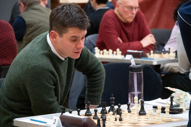 Next, with White on board 4, Martyn Jones (pictured above in a previous match) terminated Alistair Jennis’s threatening attack by spotting mate the other way.