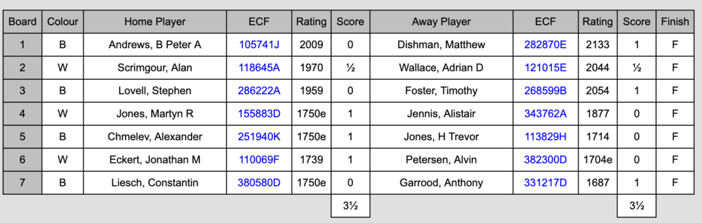On board 2, Alan Scrimgour made a quick draw with Guildford’s stand-in captain Adrian Wallace in a Spanish. The computer evaluation of the final position, a queenless middle game, was indeed level. There was plenty of material and play left for both sides, but Alan was happy to take a draw on one of the “uphill” boards, especially as the situation was starting to look encouraging elsewhere.