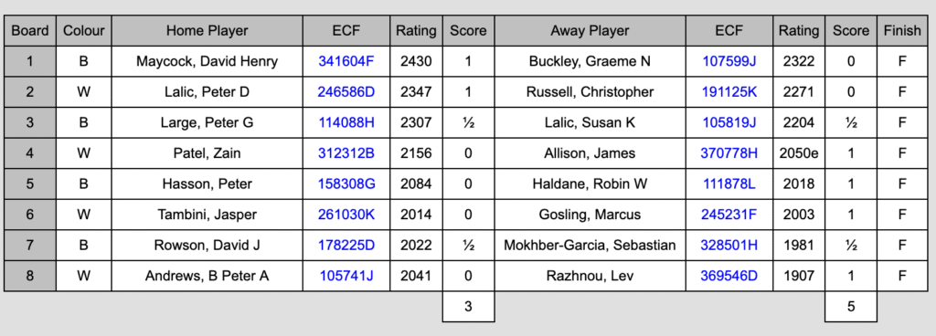 Epsom had drafted in on board 2 Chris Russell, newish to Surrey but well established in leagues in central London, so no Lalić family clash. Susan Lalić had White on board 3 against fellow IM Peter Large, and that game was a fairly peaceful and quick draw. But the others all went the distance.