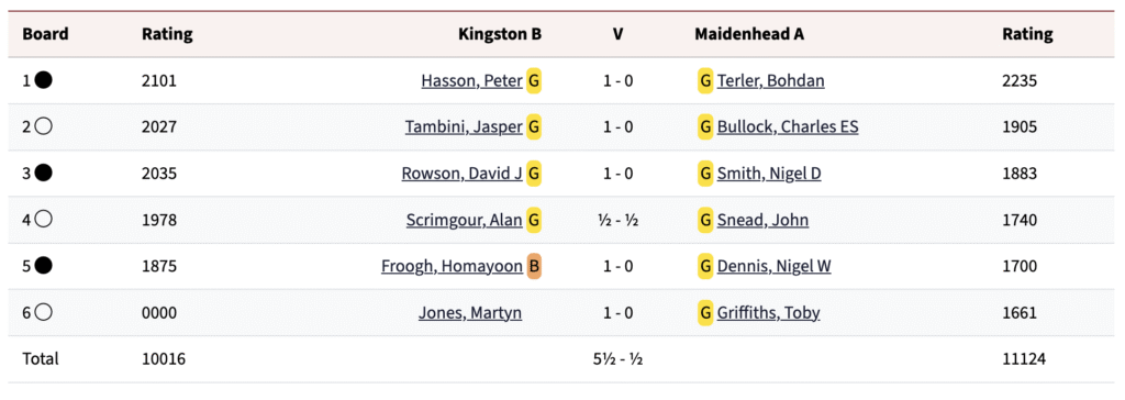 This was a fitting conclusion to a very dominant performance by Kingston B. The result gives us our first Thames Valley League division 1 points, and also, by taking points off Maidenhead, is helpful to the Kingston A team in their quest to win the league for the fourth successive year.