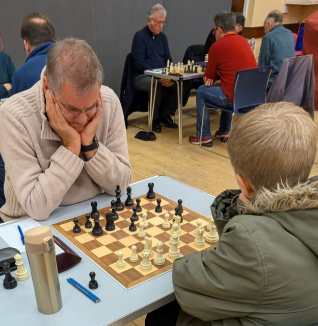 On board 4 Alan Scrimgour, with White, and John Snead were contesting a c3 Sicilian Defence. Alan commented that “The game was mostly level, even slightly better for him early on,” but he felt that he later missed a couple of chances before the position resolved itself into one where it was hard for either player to make much progress.