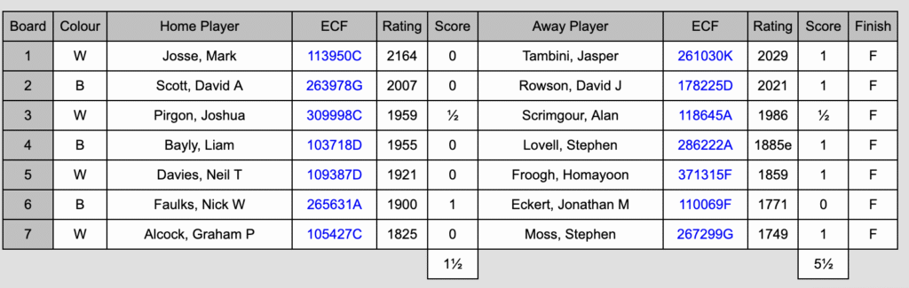 On board 5, Homayoon Froogh had Black against Neil Davies. It was an intense struggle, but after a long period of manoeuvring Homayoon got on top in a time scramble to record another good win. Meanwhile Jon Eckert, with White on board 6, was pressing Nick Faulks hard with a kingside attack. He showed principle in refusing to take a draw by perpetual check, but unfortunately a subsequent error resulted in him losing.