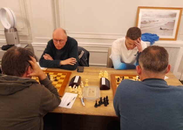 For this match I deputised as captain for Peter Andrews, who was busy moving house, though he did manage to come to the venue later to support his team. The thread of his WhatsApp commentary expressed well the twists and turns of the match, in which for a long time the final decisive result appeared improbable. Surbiton had a rating edge on five of the boards, and on the other two the ratings were close to parity.