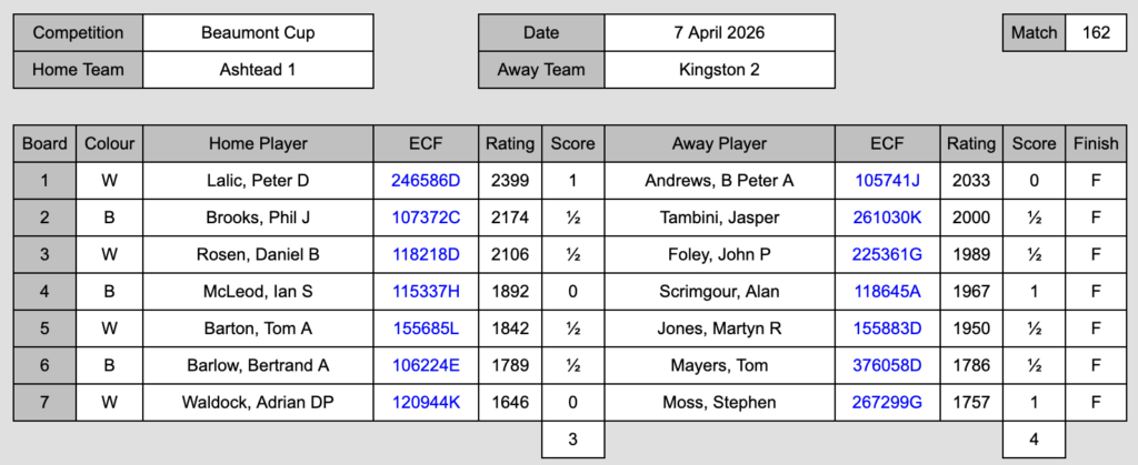 I was confident that was within our scope, but with several regulars away for holiday or work reasons, David Rowson falling ill the day before the match, and Ashtead having several strong players who occasionally turn out for them, it was by no means a done deal. Those concerns were reinforced before the start. The familiar figure of Peter Lalić was hovering in the background, and he certainly wasn’t eligible to play for us. And of course, this being Division 2, I lost the toss, giving us four Blacks out of seven.