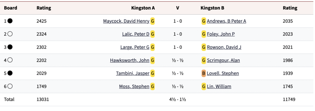 Almost by definition, an A team should beat a B team, but it is not always so easy in practice. This was demonstrated early on by John Hawksworth, who obtained an advantage out of the opening on board 4 against Alan Scrimgour’s Benoni Defence, but miscalculated on move 20 in a much better position and lost a pawn for little or no compensation. At that point Alan offered a draw, whether from fear, magnanimity, a desire to gain some rating points, or perhaps a feeling that as club secretary he shouldn’t stand in the way of Kingston A winning the league. Either way, John accepted. 0.5/0.5