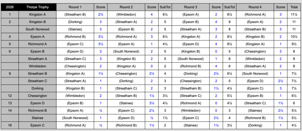 The Surrey League revived the long-dormant Thorpe Trophy – a four-round team rapidplay – in 2025, when a Kingston A team spearheaded by Peters Lalić and Large won it. The 2026 edition had the same result, but for much of the afternoon that conclusion was far from guaranteed.