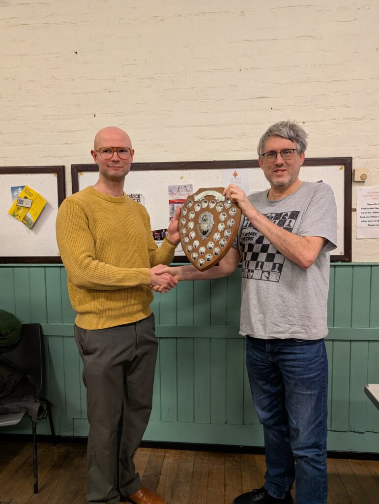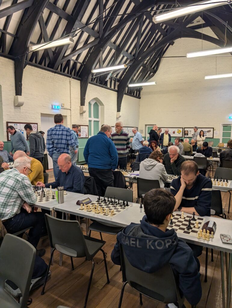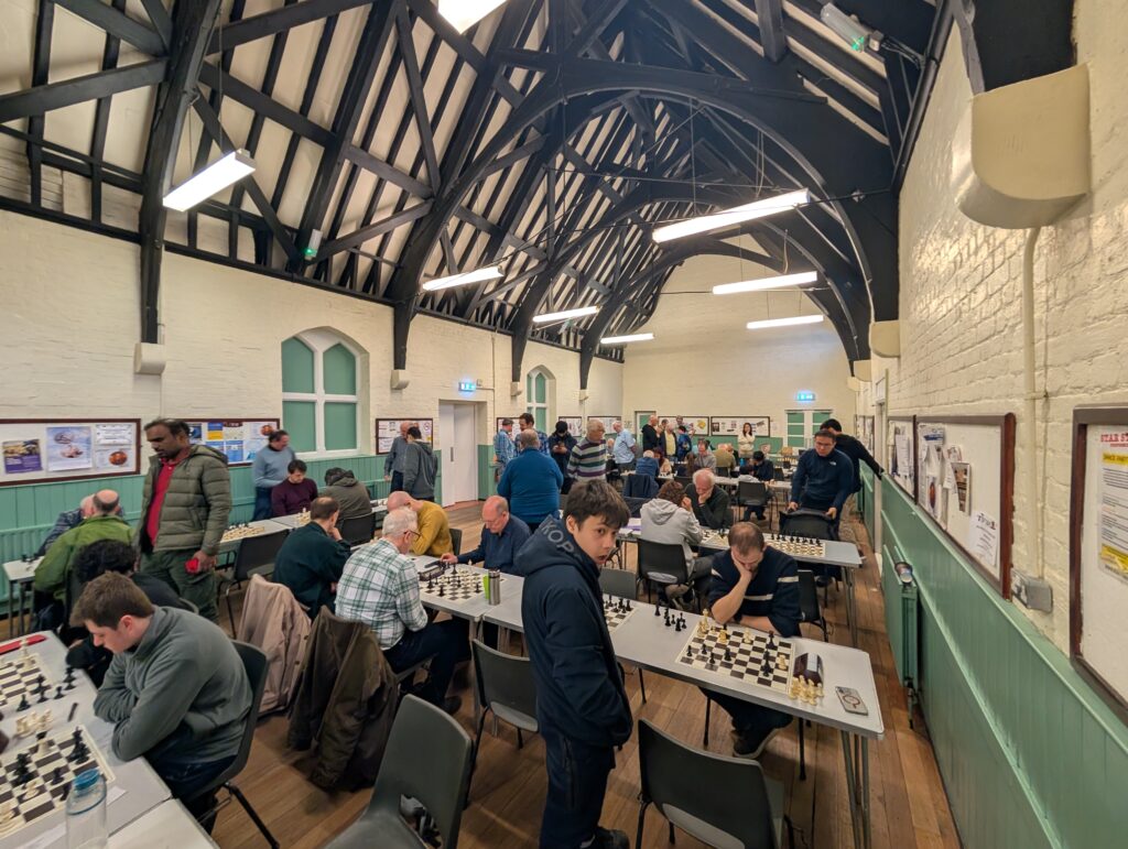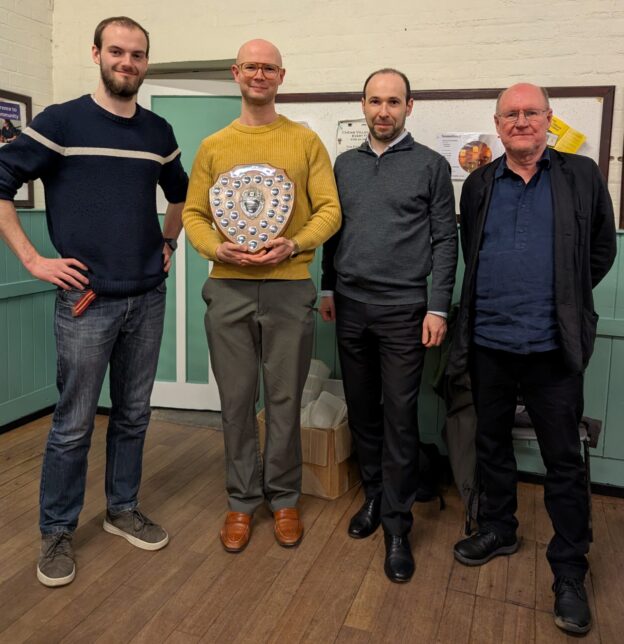 Afterwards, Peter Large reminded us that it the denouement was remarkably similar to last year. “In 2025 Kingston A were a half-point behind Kingston B and a full point behind Epsom A going into the last round,” he pointed out. “In the last round Kingston B were paired with Epsom A and Kingston A played Richmond. Kingston A won the title because Kingston B obtained a 2-2 draw with Epsom. Jasper Tambini won the crucial game for Kingston B on board 2.” Groundhog Day indeed.