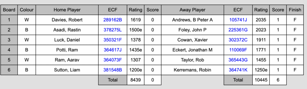 There was a scary moment before the start of this match when the Kingston players entered the playing room and found our very own Peter Lalić chilling with the Wallington players. Fortunately – for me at least – he was only there to watch the opening stages at his most local club. For Kingston second-team players to face him for a fourth time in six weeks would have been tough. There would have been room for him within the rating limit of 10,500 for the Wallington team, which had no one over 1700.