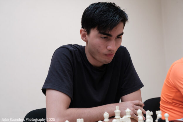 David Maycock (pictured above), with White on board 1 against grandmaster Matthew Wadsworth, led the charge with a win which defied all logic. He was 20 minutes late because of a train delay and was playing one of the UK’s strongest players – a player against whom he had suffered several defeats in recent seasons. But GM Wadsworth made a slip in the early middle game, and David pounced, playing thereafter, in the words of fellow Kingston FM Vladimir Li, “like a machine” and winning in 80 moves. A remarkable win for David after a disappointing 4NCL weekend in which he had suffered two losses. John Saunders has analysed David’s victory in our games section.