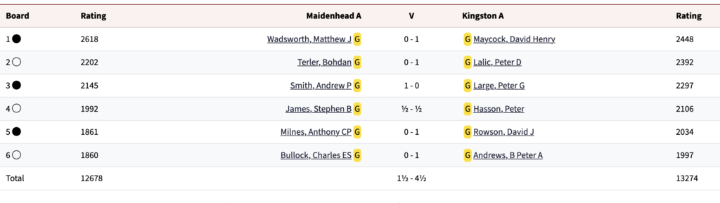 Peter Lalić recorded an emphatic victory against strong junior with Black on board 2. Terler seemed uneasy against Peter’s Philidor’s Defence and was lost as early as move 17. David Rowson and Peter Andrews had hard-fought wins on boards 5 and 6; Peter Hasson drew with Black on board 4; and the captain, worn down by the burden of office (and the long drive to Maidenhead), lost against FM Andrew Smith. But he will have been cheered by the result overall – a critical success in what is turning into a three-way fight for the title between Hammersmith, Maidenhead and Kingston.