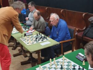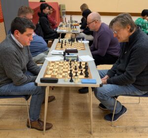This was a well-contested match between two evenly matched teams. Ed Mospan, deputising for Jon Eckert, captained and played on board 1, losing with Black to Alex McTavish. Nette Robinson, with White on board 4, levelled the score; Rob Taylor drew on board 2 with Paul Silvester, and the issue was decided in Staines’ favour on board 3, Rashvir Raikmo (again with White) beating Anqi Yang to give the match to Staines by 2.5-1.5.