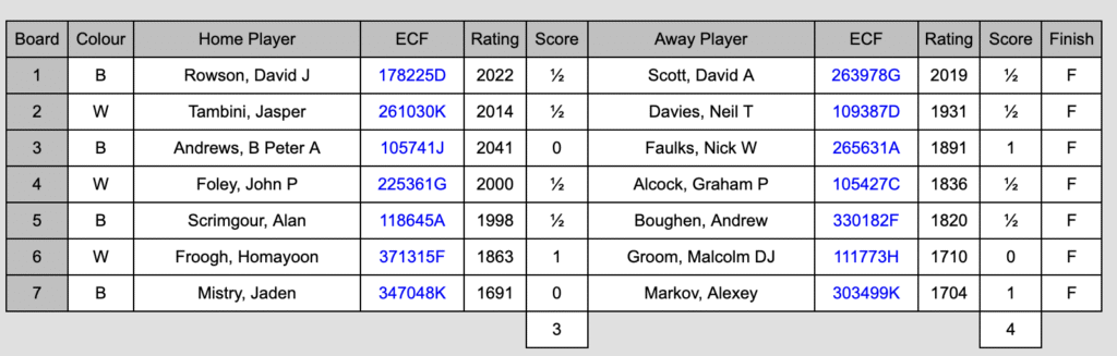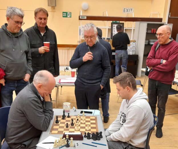 David Rowson quickly equalised with Black on board 1 against David Scott. Jaden Mistry, on board 7, reached what looked like a drawn rook and pawn ending in which his opponent Alexey Markov had a passed a-pawn but Jaden had a four to three majority on the kingside. Jaden pushed his majority and penetrated with his king, but perhaps pushed too hard for the win and went down to defeat. However, Homayoon Froogh soon netted the equaliser with a win on board 6 against Malcolm Groom. Having built up a strong and lasting kingside attack, he missed the chance of a spectacular sacrificial win here.