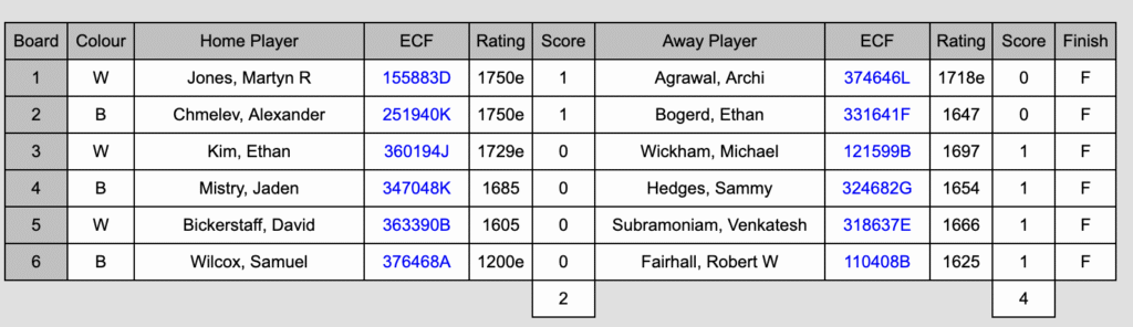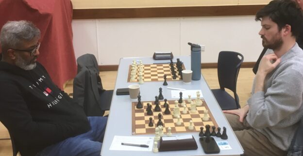 Things did not go quite so well on the lower boards. On board 4, Jaden Mistry lost with Black to Sammy Hedges in a Queen’s Gambit Declined; on board 6, Sam Wilcox was defeated by the capable Robert Fairhall in a Danish Gambit; on board 3, Epsom veteran Michael Wickham had too much nous for promising Kingston youngster Ethan Kim; and on board 5 David Bickerstaff (pictured above, right) lost to Venkatash Subramoniam. Kingston captain Edward Mospan described the latter game as “ping-pong chess”, and said David had good chances before eventually succumbing.